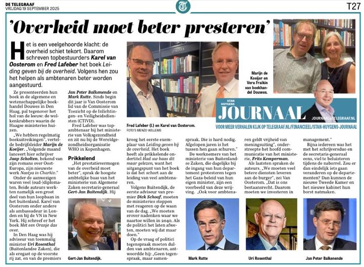 In zijn toespraak ging hij in op zijn wens om te komen tot meer integraal beleid in Den Haag, nog betere samenwerking tussen ministeries en het vergroten van de leidinggevende capactiteiten van het middenkader. En vervolgens hoe ons boek daaraan kan bijdragen. Hij noemde verder het managen van je eigen manager en het Mieke Telkamp model als onderwerpen die hem in het boek waren opgevallen.